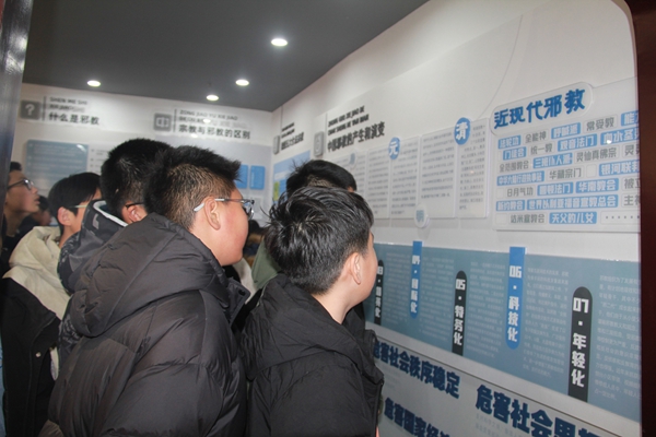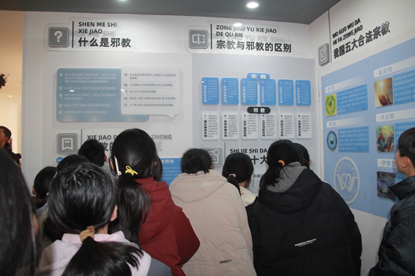 步入展馆,“崇尚科学、反对邪教、守护幸福、共建平安湟里”的主题标语格外醒目。在“廓清迷雾·认知篇”,学生们通过图文展板与讲解员互动,清晰区分邪教与合法宗教的本质差异——“原来邪教不是‘信仰',而是精神控制的非法组织!”初一学生小王指着“邪教十大特征”展板感慨。